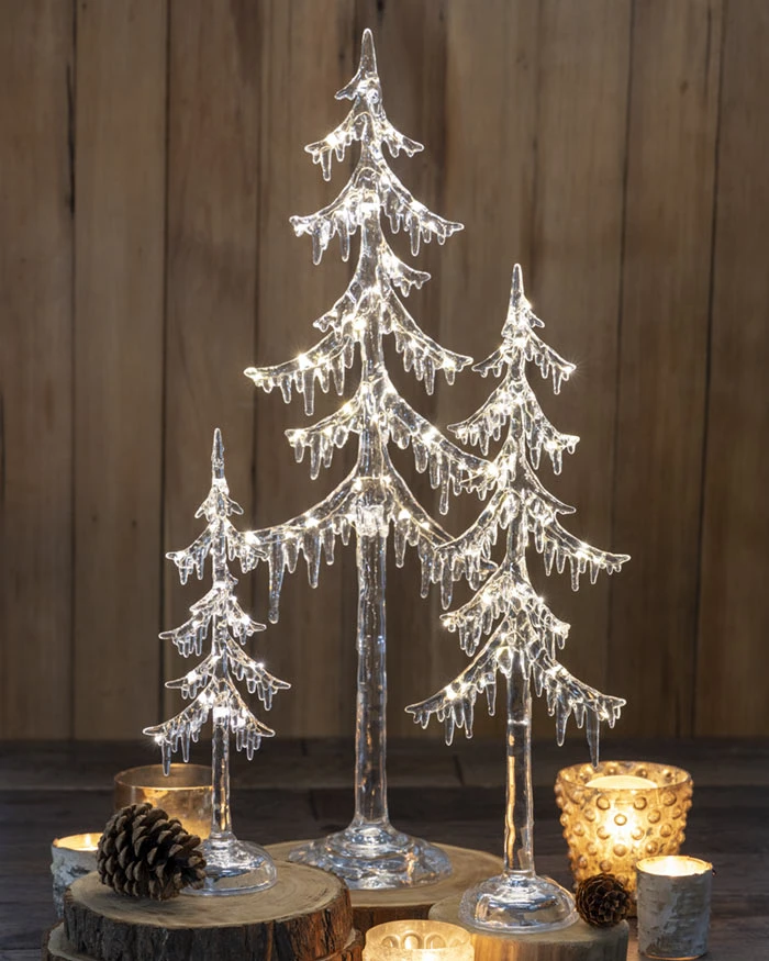 NEW! Resembling a miniature grove of trees after an ice storm, our Arctic Lit Trees are crafted of an acrylic composite with battery powered LED lights. Trees measure approximately 12″, 18″, and 25″ tall and the set of 3 arrives packaged together in Olive & Cocoa® gift wrap with ribbon.