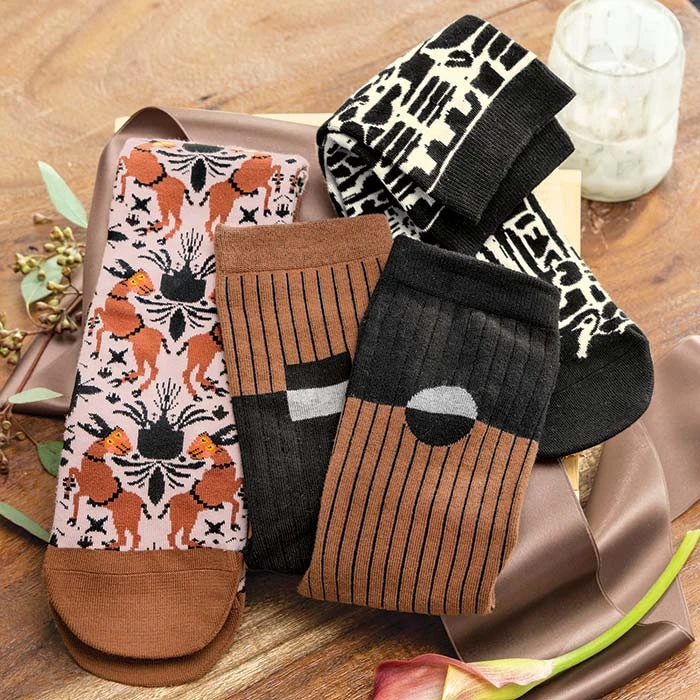 Comfort meets fashion in our Autumn Ladies’ Sock Tote. Woven of the softest, stretchiest combed cotton blend, set includes three pairs of socks—each with a unique design and color palette—to subtly accentuate her style. Women’s one size fits most socks arrive packaged in a signature Olive & Cocoa® canvas and burlap tote with ribbon.