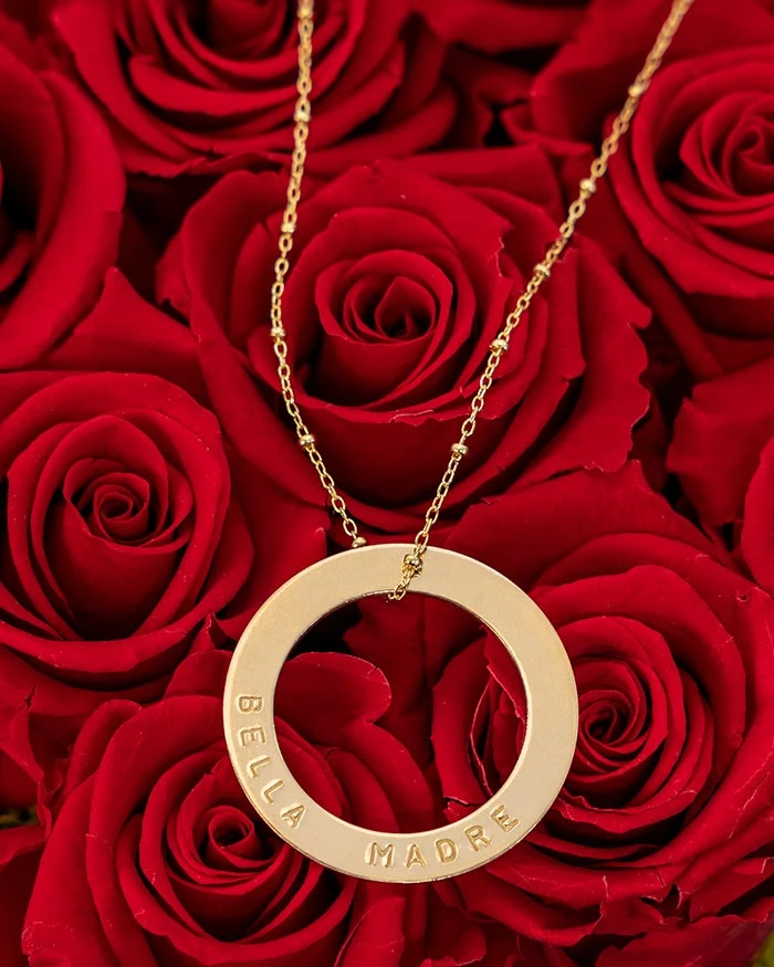 An embodiment of love both pure and true captured in a gift of gold. The words āBella Madreā meaning āBeautiful Motherā are stamped in a 1 ½” diameter 14-karat gold filled hoop using the art of lost wax casting. Delicate 14-karat gold filled chain measures 18″. Necklace comes gift wrapped in a hand crafted wood crate with ribbon.