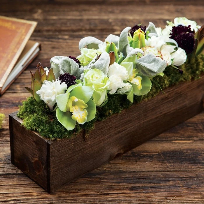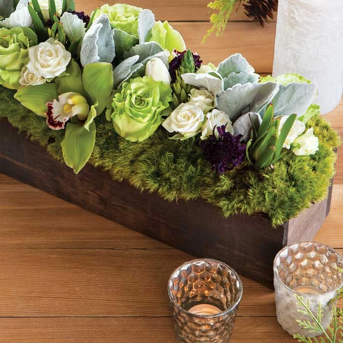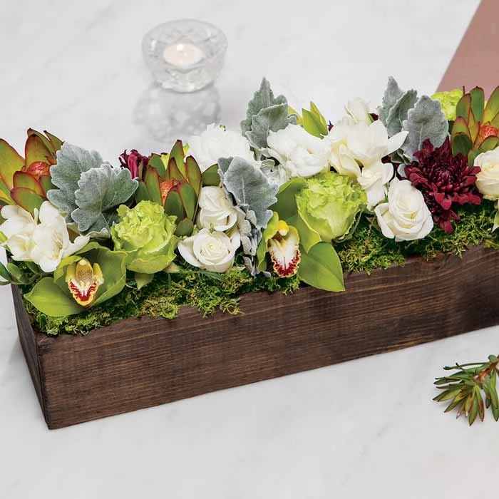 Gracefully evoking a feeling of serenity, a simple gathering of delicate white flowers accented with deep eggplant, vivid chartreuse, and soft silver is displayed in a dark stained hand crafted wood trough. Bianca Grace measures approximately 15″ x 4″ x 8″ to top of arrangement and requires next day shipping.