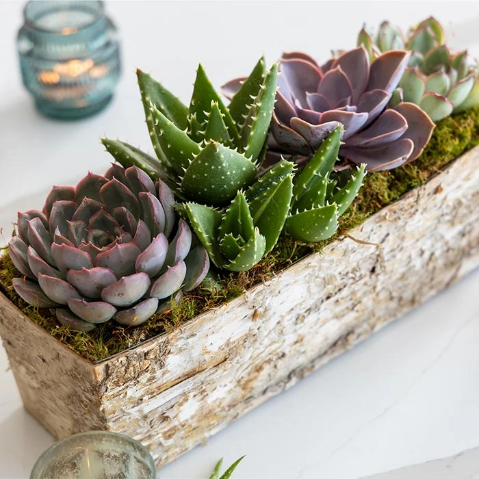 Send a natural arrangement with a distinguished flourish. Beautifully arranged in a charming planter, our Birch Bark Succulent features a row of hardy succulents gathered in a nest of moss. Birch Bark Succulent measures approximately 12″ x 4″ x 6″ tall and requires 2nd day shipping.