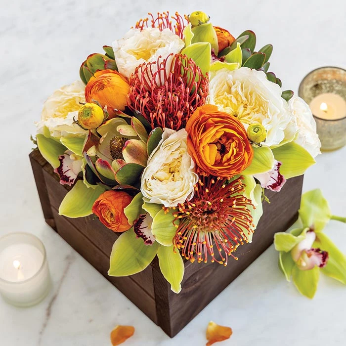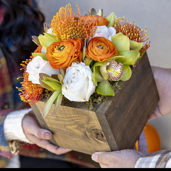 A collection of autumnal orange, crème, and green blooms are expertly arranged in a dark stained hand crafted wood box. Carlotta measures approximately 7″ x 7″ x 10″ to top of arrangement and requires next day shipping.