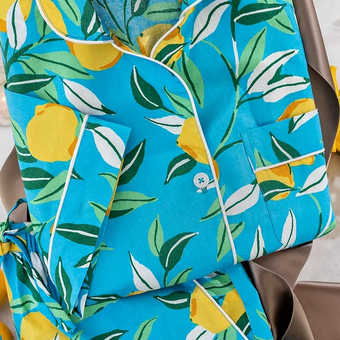 Sunny lemons on a cool blue background add zest to her sleepwear. Woven of 100% cotton with contrasting white piping, our Cool Lemon Short Pajamas have a short sleeve button front shirt and shorts with an elastic drawstring waistband. Available in women’s sizes small, medium, large, and extra large, pajamas arrive gift wrapped in a hand crafted wood crate with ribbon.