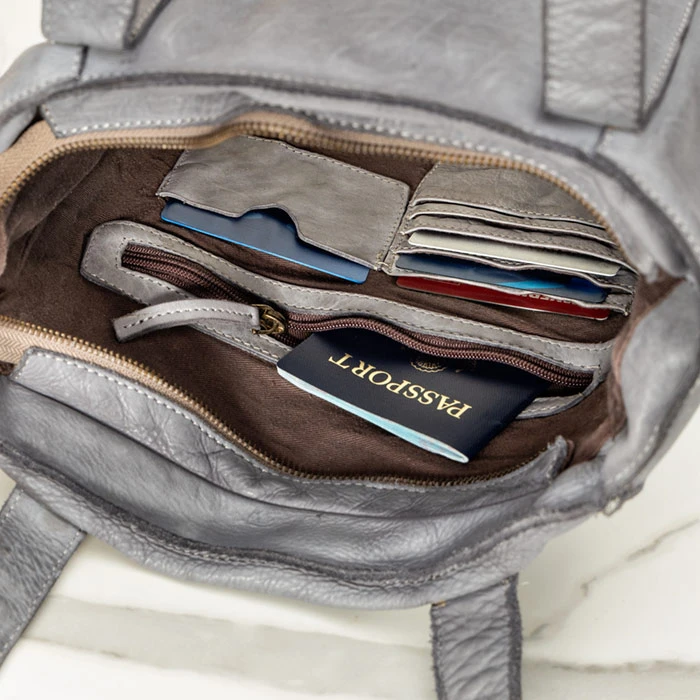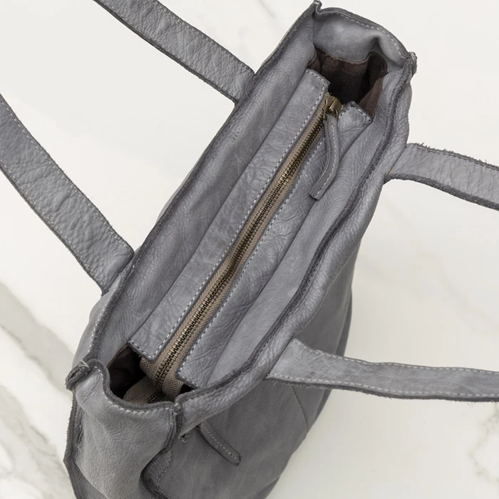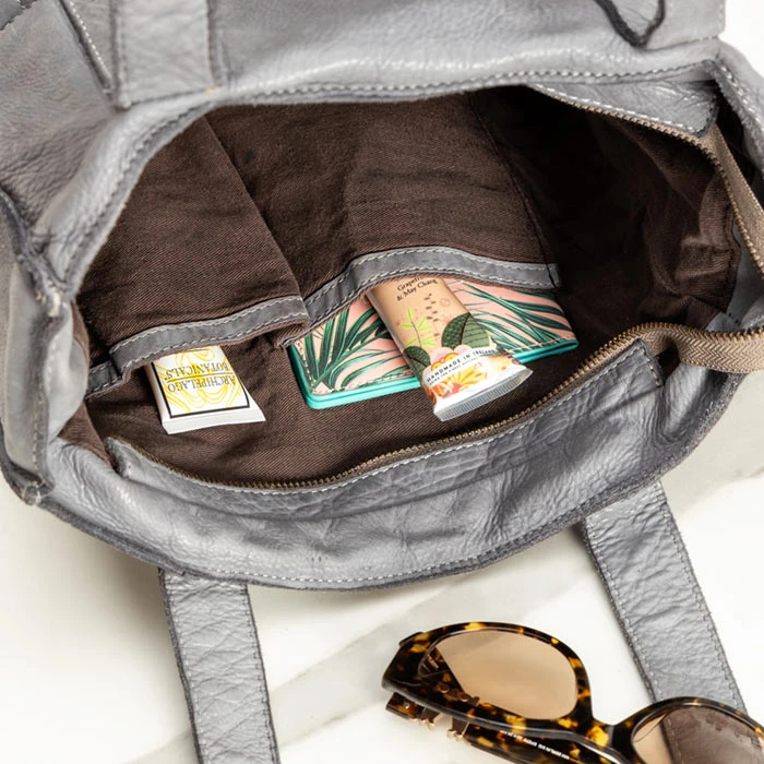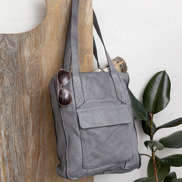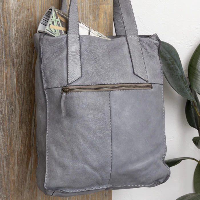 NEW! Crafted of soft grey leather, our tall tote is generously sized with pockets galore. Leather tote has a zip top closure, 2 external pockets, 4 interior pockets, and a built in credit card organizer. Fabric lined tote measures 12″ x 3 ½” x 14″ with a 12″ drop and arrives packaged in Olive & Cocoa® gift wrap with ribbon.