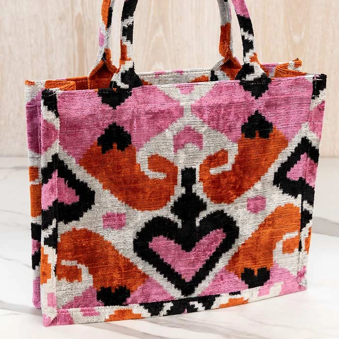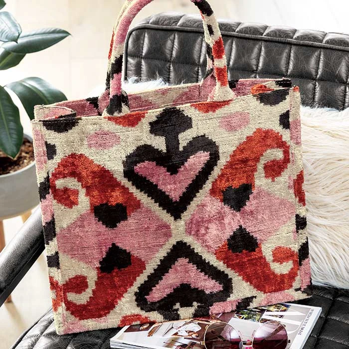Repeating patterns with hidden hearts come to life in shades of red, pink, and crème. Our structured Ikat Heart Tote is generously sized with a distinctly textured exterior. Featuring an open top and an interior drop pocket, lined handbag measures approximately 16″ x 13″ x 4″ with a 7″ drop and arrives packaged in Olive & Cocoa® gift wrap with ribbon.