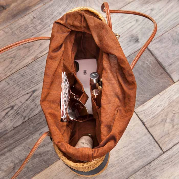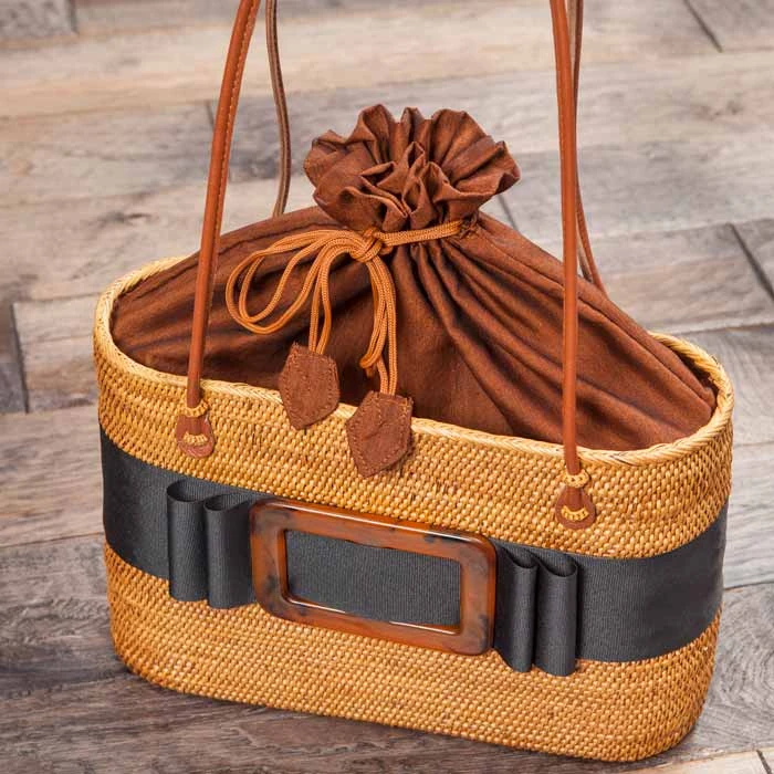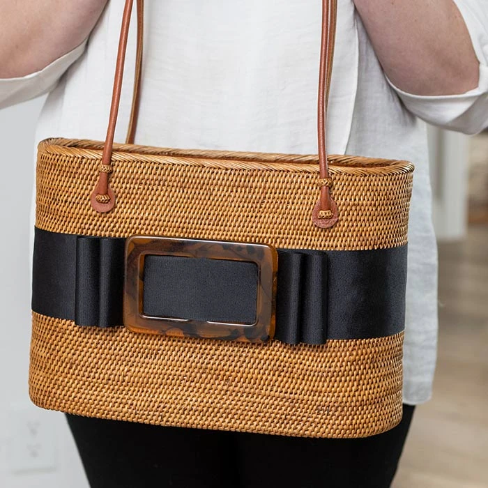 Crafted of wicker and wrapped in a wide black ribbon with a tortoise shell buckle on front, our handbag will have onlookers wondering if she’s on her way to a gala or brunch al fresco. Finished with an attached shantung-like lining with drawstring closure and leather handles, handbag measures approximately 13″ x 4″ x 9″ with an 11″ drop and arrives packaged in Olive & Cocoa® gift wrap with ribbon.