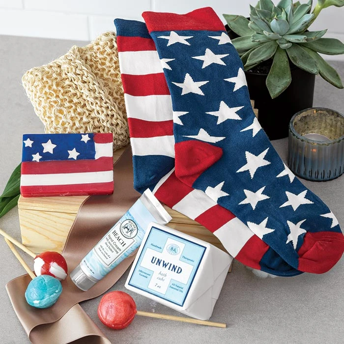 Share a collection that gives her the freedom to relax. Set includes an American flag bar soap, an “Unwind” bath cube, sea breeze hand cream, sisal body scrubber, stretchy stars & stripes socks, and 3 old fashioned lollipops. All arrive gift wrapped together in a hand crafted wood crate with ribbon.