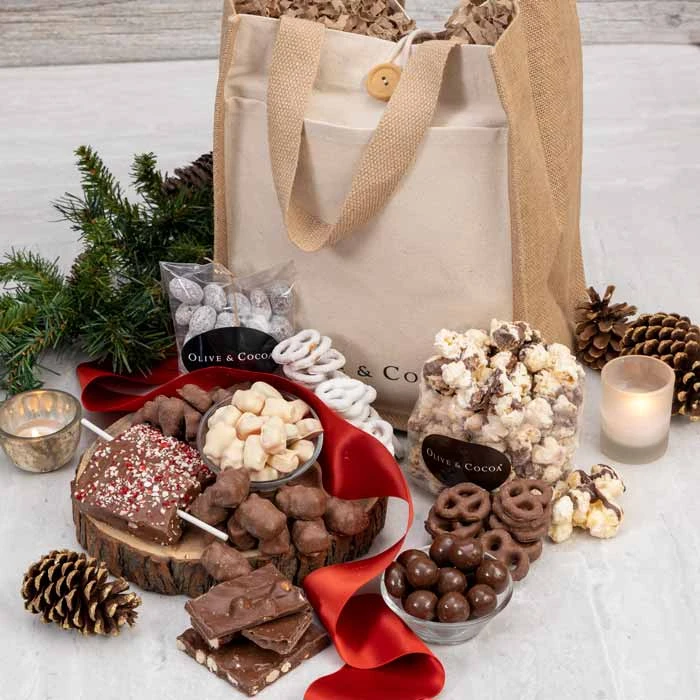Satisfy a cocoa lover’s sweet tooth with Lots of Little Holiday Chocolates. Petite includes rocky road popcorn, chocolate cinnamon bears, white chocolate gummy bears, milk chocolate pretzels, dusted toffee almonds, and old fashioned malted milk balls. Medium also includes dunked marshmallow sticks, milk chocolate gummy bears, chocolate almond bark, and white chocolate pretzels. Large also includes extra rocky road popcorn, white chocolate peppermint popcorn, chocolate covered toffee, peppermint sprinkled dunked sandwich cookies, and chocolate caramel squares. Each size is gift wrapped in a hand crafted wood crate with ribbon.