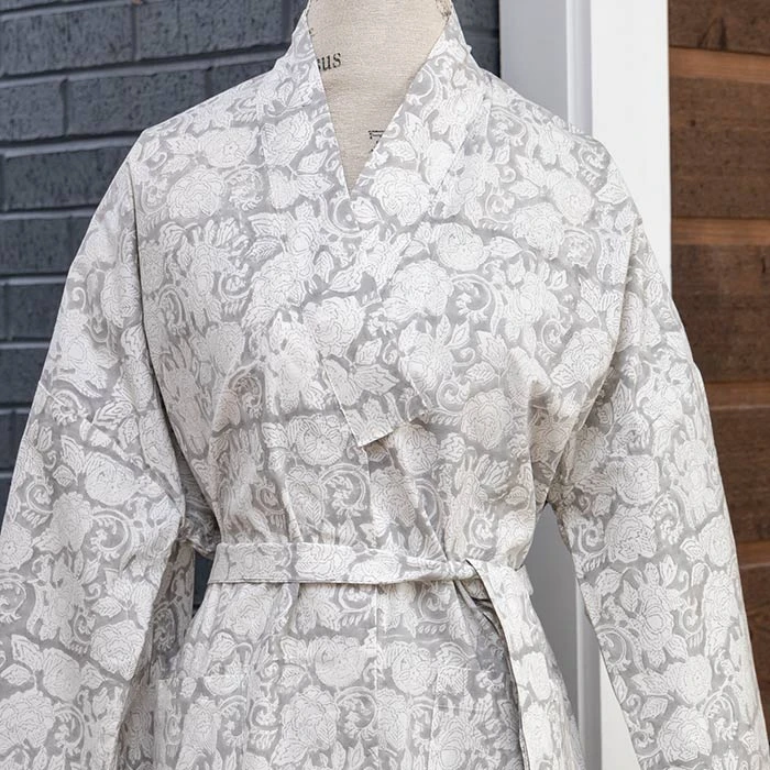 With a classic rose damask inspired pattern in hues of white and grey, our soft robe is the ultimate in relaxation. Woven of 100% cotton with two front pockets and a matching belt, Montclair Cotton Robe is women’s one size fits most, measures approximately 52″ from collar to hem, and arrives gift wrapped in a hand crafted wood crate with ribbon.