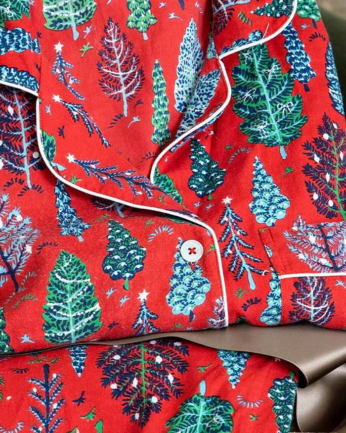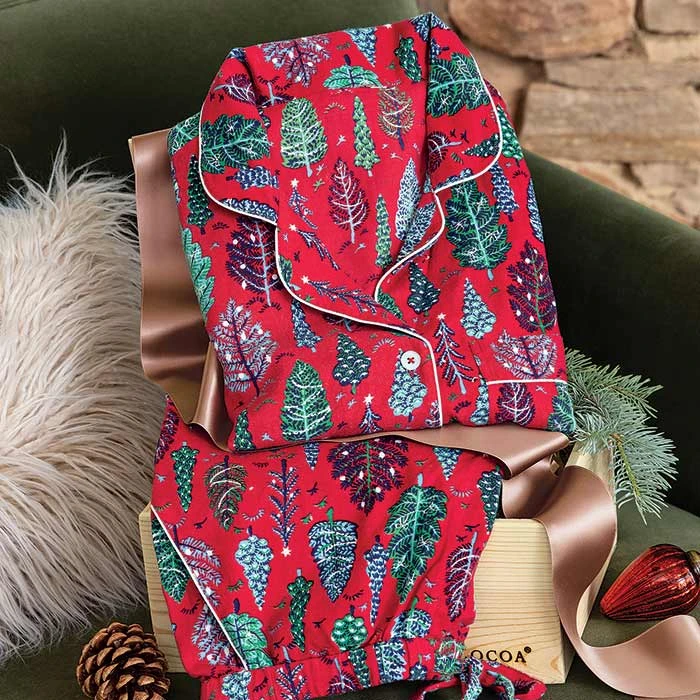 How lovely are thy branches! With beautiful trees on a rich rouge background, these lightweight organic cotton flannel pajamas have a long sleeved button front top and drawstring pants with an elastic waistband and side pockets. Available in women’s sizes small, medium, large, and extra large, pajamas arrive gift wrapped in a hand crafted wood crate with ribbon.