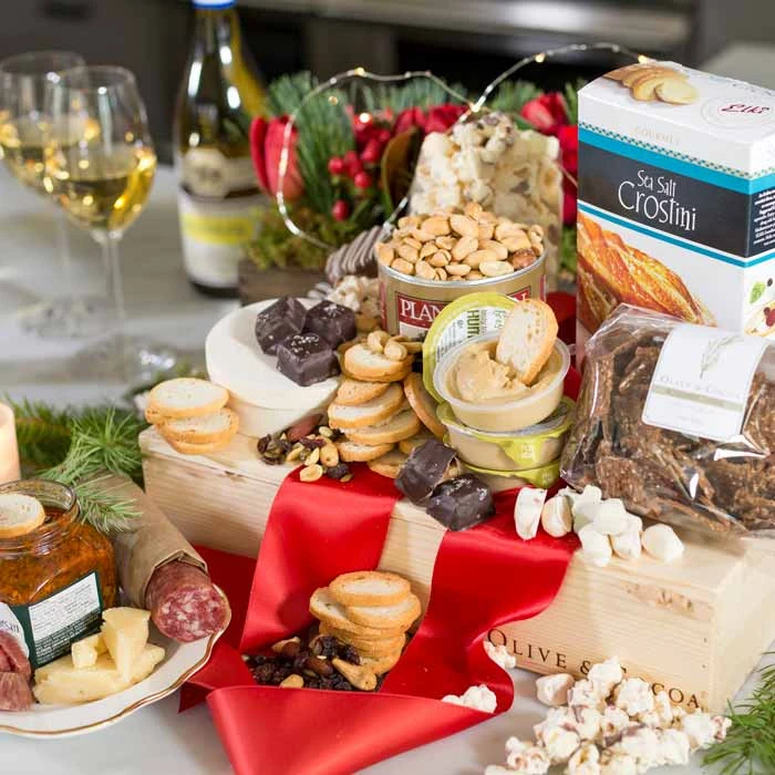 A little sweet, a little savory, and a whole lot to share! Brimming with ready to eat nibbles for everyone to enjoy, petite includes white chocolate gummy bears, trail mix, rocky road popcorn, rustic crackers, and hummus. Medium also includes gourmet salami, sundried tomato spread, and a 12 oz. tin of gourmet salted peanuts. Large also includes chocolate covered sandwich cookies, sea salt crostini, savory cheese spread, and walnut pecan caramel marshmallows. Each size comes gift wrapped in a hand crafted wood crate with ribbon.