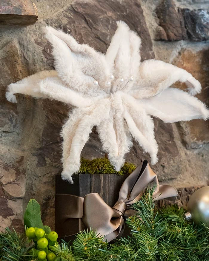 Send them the beauty of a perennial flower with a charming twist. With fuzzy white petals in the shape of a traditional poinsettia flower, our unique arrangement has pearly accents and is “planted” in a dark stained wood box. Snowy Pearl Faux Poinsettia measures approximately 5″ wide by 17″ tall and arrives adorned with a fluffy signature Olive & Cocoa® satin bow.