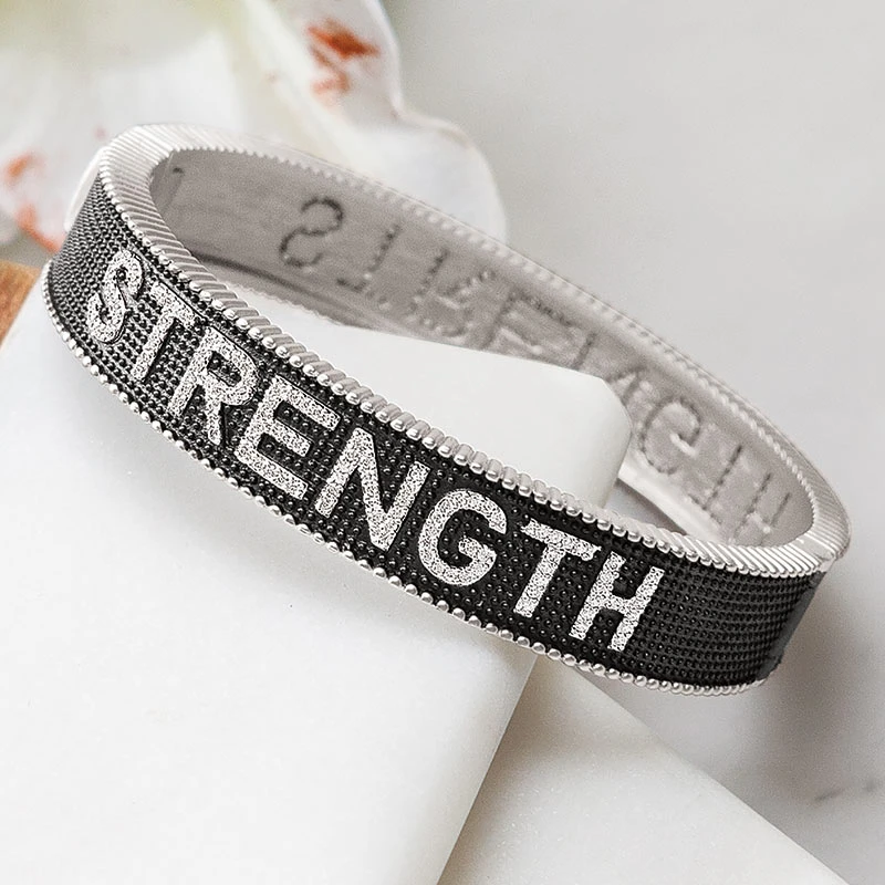FREIDA ROTHMAN Bold, sparkling, and a celebration of her inner strength. Meticulously crafted of sterling silver with a matte rhodium finish and crystalline accents spelling out “STRENGTH,” hinge clasp bangle measures approximately 2 ½” in diameter and arrives gift wrapped in a hand crafted wood crate with ribbon.