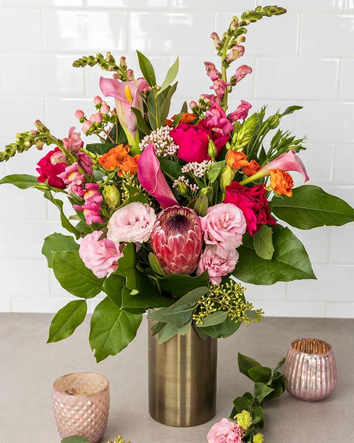 Our Summer Garden Market Bouquet is hand gathered and presented in market wrap to bring the best of the season right to their door. We hand select farm fresh stems to create a lush, rosé hued bouquet. Available with an optional vase, bouquet requires next day shipping.