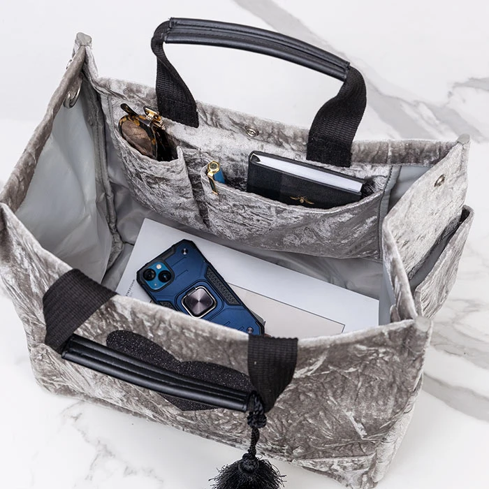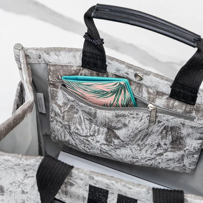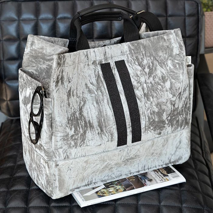 “It’s just a little crush.” With a crushed velvet exterior in classic silver grey, generously sized structured bag features a snap closure, 2 exterior pockets, 3 interior pockets, metal feet, and a detachable shoulder strap. Lined handbag measures approximately 14″ x 14″ x 8″ with a 5″ drop and arrives packaged in Olive & Cocoa® gift wrap with ribbon.